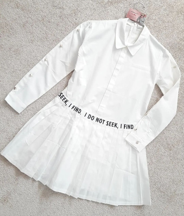 جزئیات: یقه مردانه، جیب نما، دامن پلیسه، آستین دکمه نما، پشت زیپ دارد