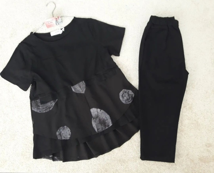 سایز L: بلوز: عرض سینه 58، عرض پایین بلوز 71، قد جلو 60، قد پشت 69، قدآستین 20، شلوار: عرض باسن 50، عرض ران 29، قد 70 اندازه ها بدون کشیدن هستن